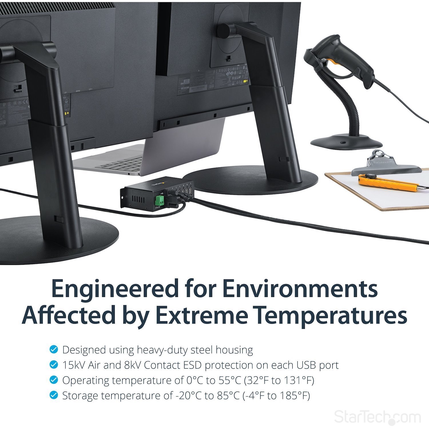 Perfect for factory environments, the rugged hub also supports a wide operating temperature range (0°C to 55°C) and offers surge and ESD protection to each USB port, which can help prevent damage to your connected devices.